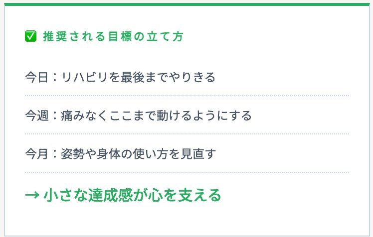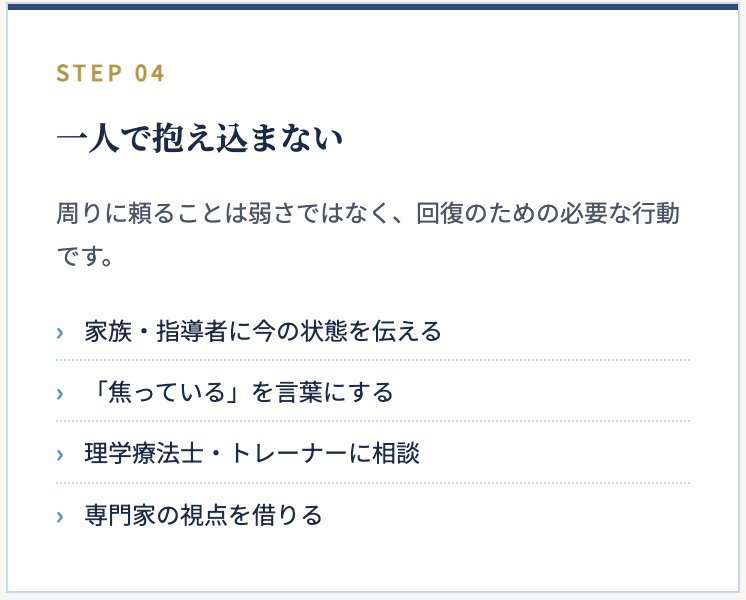医療機関、理学療法士、トレーナーなど、状況を整理してくれる人に相談することで、今やるべきことが見えやすくなります。
