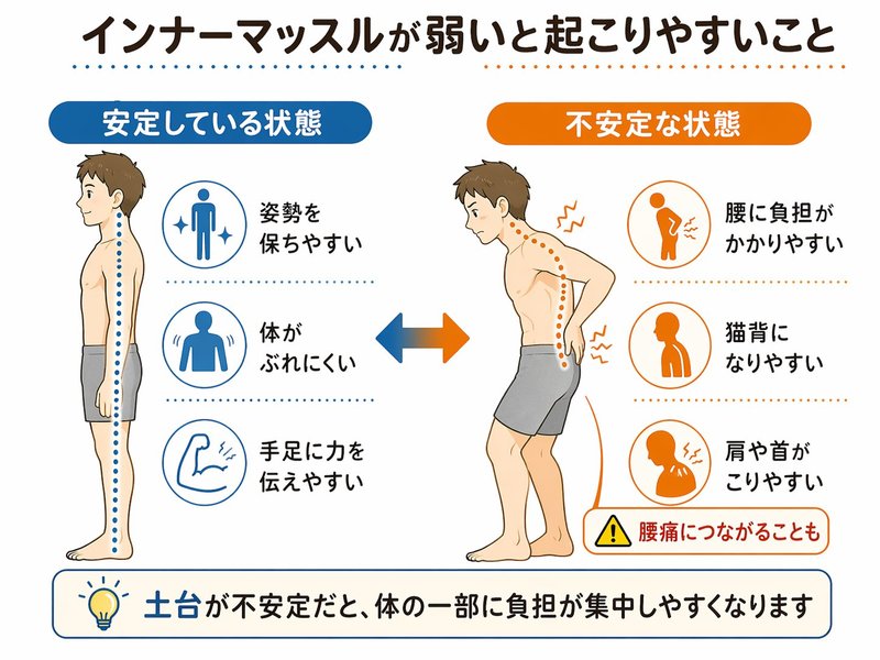 インナーマッスルは見た目ではわかりにくい筋肉ですが、体を安定させ、動きを支えるうえでとても大切です。