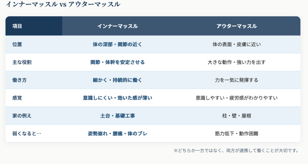 ただし、土台となるインナーマッスルがうまく働いていないと、アウターマッスルばかり頑張る状態になり、肩こりや腰痛、姿勢の崩れにつながることがあります。