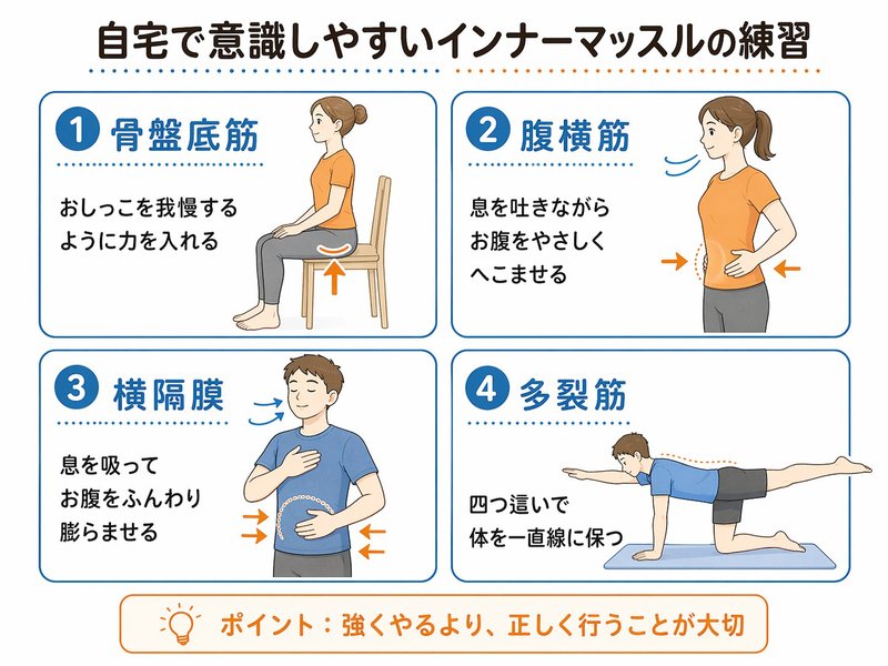 特にインナーマッスルは、回数や負荷よりも、呼吸や姿勢、余計な力みを減らしながら行うことが重要です。