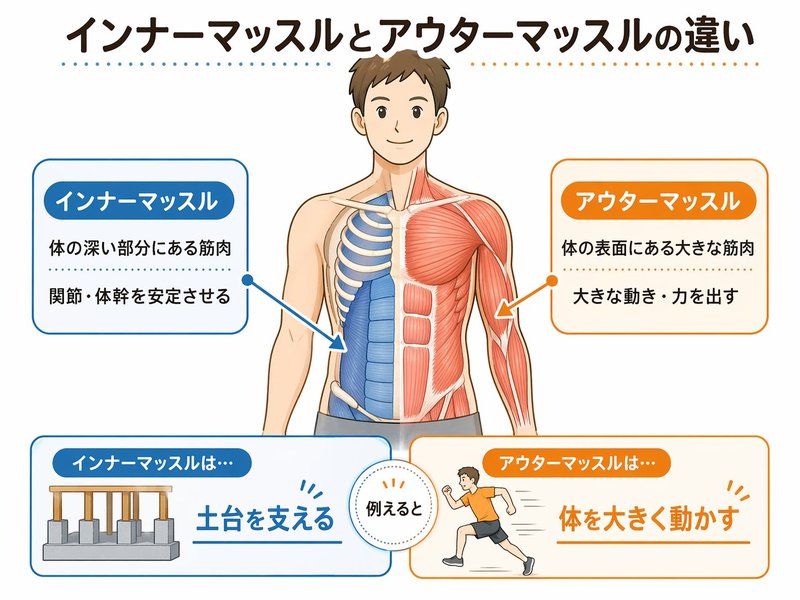 それに対してインナーマッスルは、動きそのものを大きく作るというよりも、関節や体幹を安定させる土台として働きます。